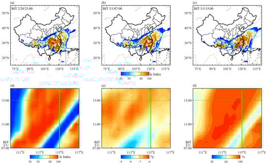 In conjunction with the weak cold front moving from the northwest to the southeast of China, the corresponding variations in the high-value area of the Ic index are analyzed to reflect the relationship between the front and the meteorological environment of icing formation. From the spatial distribution of the Ic index at 550 hPa from 23:00 BJT on 28 February to 15:00 BJT on 1 March (Figure 3a–c), it can be found that with the eastward and southward movement of cold air (as shown in Figure 2), the severe icing potential area (Ic index > 80) gradually moved from Hubei and Hunan to Jiangxi Province, and thus a high-value center appeared at the time and location corresponding to the icing accident. The time-longitude profile of the Ic index (Figure 3d) suggests that the icing area moved from west to east in synchronization with cold air. The above correspondence not only reflects the accuracy of the Ic index in indicating the icing areas, but also, more importantly, reflects the relationship between the cold frontal process and the icing formation. Furthermore, the 550 hPa temperature over the incident location gradually increased with time (solid green line in Figure 3e), which is related to the arrival of warm air before the cold front. However, in terms of the temperature value, the upper-level temperature was below 0 °C on the day of the incident, and at 15:00 BJT of that day, the upper-level temperature was −7 °C. Therefore, although the warm air ahead of the cold front did contribute to a temperature increase, the magnitude of this increase was not substantial, and the 550 hPa temperature remained within a range conducive to icing. This is a key factor in satisfying the temperature conditions necessary for icing in the atmosphere. For humidity conditions (Figure 3f), the relative humidity variation closely resembled the pattern of the Ic index (Figure 3d) in the incident location. The saturation degree of the atmosphere increased continuously over the incident location, from 60% to about 100%, providing sufficient water vapor for atmospheric icing conditions. Therefore, the low-temperature and high-humidity conditions suitable for icing near the altitude of 5000 m recorded in the investigation report of this icing accident are closely related to the cold frontal process.