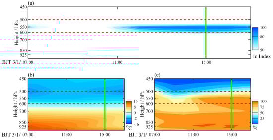 Altitude-time profiles of the (a) Ic index, (b) temperature, and (c) relative humidity. The green solid lines indicate the time of the icing accident, and the red dotted lines represent the heights of 600 hPa and 500 hPa.