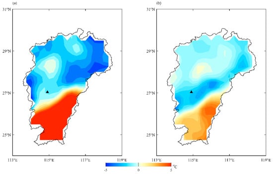 (a) Past 24 h and (b) 3 h temperature difference at 15:00 BJT on 1 March. The black triangles represent the location of the icing accident.
