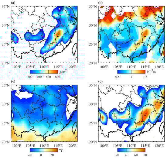 Based on satellite remote sensing data, the characteristics of hydrometeors in the cold front cloud system, which is caused by the uplift of warm-moist airflow, can be identified. The cloud liquid water path can represent the total liquid water content in the vertical atmospheric column, which is often used to reflect the supercooled water content in clouds. Figure 6 presents the spatial distributions of the cloud liquid water path, effective particle radius, cloud top temperature, and optical thickness. As presented in Figure 6a, the cloud liquid water path at the location of the incident exceeds 700 g/cm2, indicating a high-humidity environment. The accumulation of a large amount of liquid water vapor in cold clouds can produce sufficient supercooled water. Once this liquid water vapor touches the surface of the aircraft, serious icing can occur. In terms of the liquid water content (Figure 4c), the formation of its high-value areas in clouds is related to the rapid increase of relative humidity at the icing altitude, which is the result of water vapor lifting along the front to condense liquid water. Effective particle radius can represent the size of cloud droplet particles. Larger cloud droplets are more likely to form stronger icing when they touch the aircraft’s surface. From Figure 6b, it can be seen that the spatial distribution of the large-value regions of effective particle radius is similar to that of the cloud liquid water path. The region where icing occurs is filled with large cloud droplet particles with an effective particle radius of larger than 14 μm, which is a favorable condition for icing. For the physical characteristics of clouds, the cloud-top temperature in the icing region (Figure 6c) is about −15 °C, from which it can be inferred that the temperature within clouds is around −10 °C. This temperature range not only indicates cold cloud characteristics but is also not too low, making it conducive to the existence of a large amount of supercooled water in low and medium clouds. Analyzing the optical thickness (Figure 6d), we found that the optical thickness of the icing area is greater than 70, and this area is covered by dense cold clouds, which is also consistent with the stratiform clouds described in the accident investigation report. The above-mentioned analysis has likewise verified the applicability of satellite remote sensing data in the identification of aircraft icing regions, and the application of satellite data will make up for the deficiency of icing observations.