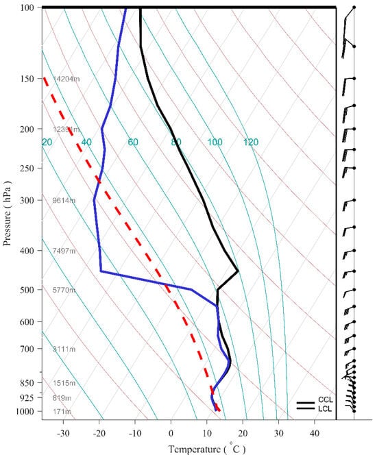 In addition to the stratiform cloud system produced by frontal uplifts, a large amount of latent heat released by adiabatic cooling of low-level water vapor can also alter the atmospheric stability, thus affecting the liquid water content in clouds. Figure 7 is a Skew-T Log-P diagram at 08:00 BJT on 1 March, which is based on the sounding data from Nanchang station (the closest to the accident location and in the same icing condition). From 925 hPa to 500 hPa, the ambient temperature profile is on the right side of the state curve, which indicates that the atmosphere is stable on the backside of the front under the influence of the frontal weather. At the same time, below 550 hPa, the dew point temperature difference is small, suggesting that the atmosphere is close to saturation. Such a stable atmospheric environment with temperature inversion at low levels weakens the convective exchange between the upper and lower layers, which is conducive to the accumulation of water vapor in clouds and temperature decrease, contributing to the formation of the large-value areas of the cloud water vapor path in Figure 6a.