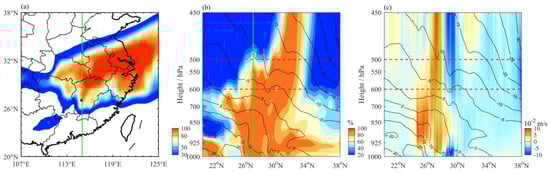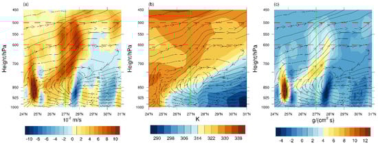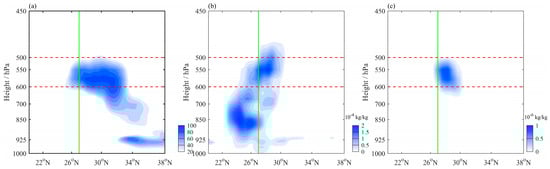 Height–latitude profiles of the meridional circulation (black streamline) superimposed on the (a) vertical velocity, (b) pseudo-equivalent potential temperature, and (c) water vapor flux across Ji’an City at 15:00 BJT on 1 March. The green lines show the latitude of the accident location, and the red dotted lines show the heights of 600 hPa and 500 hPa.