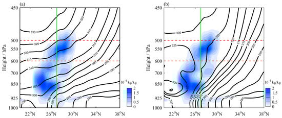 Same as Figure 10b, but with superimposed (a) potential temperature and (b) pseudo-equivalent potential temperature.