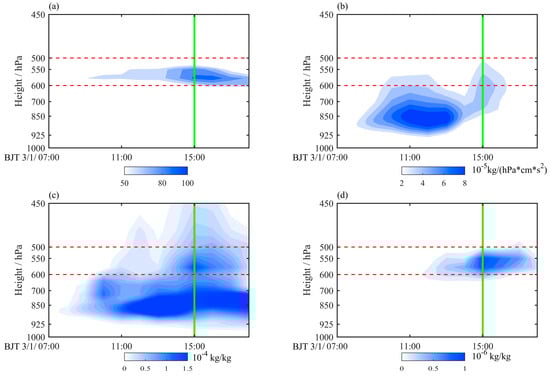 Altitude–time cross-sections of the simulated (a) Ic index, (b) vertical water vapor flux, (c) liquid water content, and (d) ice water content in Ji’an City from 07:00 BJT to 19:00 BJT on 1 March. The green solid lines represent the time of the accident, and the red dotted lines show the altitudes of 600 hPa and 500 hPa.