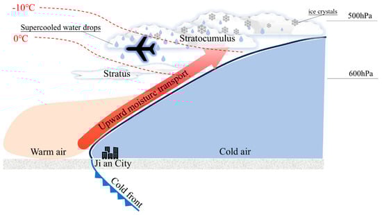 Conceptual model of the weather conditions for aircraft icing formation under the influence of a cold front.