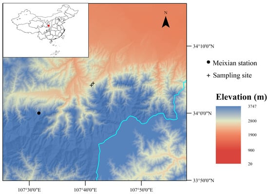 Location of the sampling site and Meixian meteorological station. The red dot indicates the specific location of the sampling area.