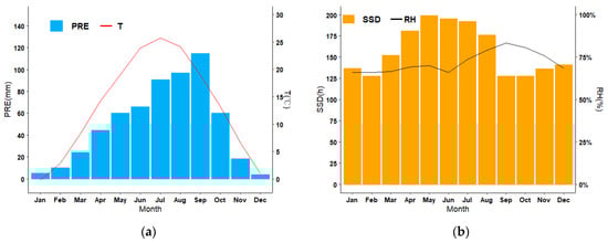 where Tmean represents the mean monthly air temperature (°C), RH (%) represents the mean monthly relative humidity, es represents the water vapor pressure, and ea represents the actual water vapor pressure. The highest temperature typically occurs in July, while the lowest temperature is observed in December. Rainfall is primarily concentrated in the summer and early autumn, comprising approximately 60% of the total precipitation in a year (Figure 2a). This period is also the highest RH (Figure 2b), while late spring and summer experience the most sunlight.