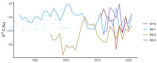 The curves of δ13C values obtained for the four cores exhibited notable short term differences. The S1-5 curve shows a sharp negative slope after 2012 and displays low values until 2016. The S2-1 curve shows a gentle rise between 1985 and 2000, followed by a negative slope until 2011, then exhibits fluctuations until 2021. The S2-2 curve shows a sharp rise between 1995 and 2005, followed by a negative slope until 2012, with oscillations observed until 2021. After 2012, the S2-1 and S2-2 curves show the same change pattern. The S2-3 curve increases initially and then decreases, with high values observed in 2014 and 2017 (Figure 3).