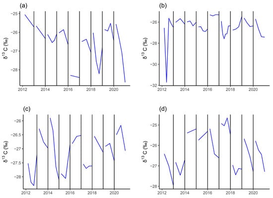 The intra-annual variations of δ13C values in tree ring cores from 2012 to 2020; (a) core S1-5; (b) core S2-1; (c) core S2-2; (d) core S2-3.