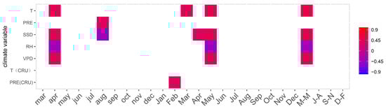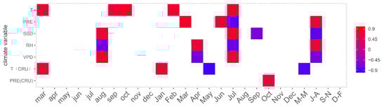 The Pearson’s correlation coefficients of the δ13C values of core S2-2 versus monthly environmental variables. Only significant correlations (p < 0.05) are shown. On the x-axis, lowercase and uppercase letters indicate the month of the previous and current year, respectively. The climate variables include monthly mean temperature, precipitation, sunshine duration hours, relative humidity, and vapor pressure deficit.
