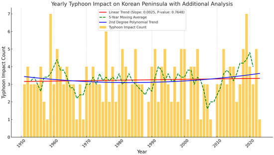 Typhoon Impact Frequency refers to the annual number of typhoons that impact the Korean Peninsula. The frequency of typhoon impacts since 1904, when meteorological observations on the Korean Peninsula began, is illustrated in Figure 1. The number of typhoons each year shows considerable variability, and there appears to be a cyclical pattern. Typhoon frequency increased during the late 1960s and early 2010s. The slope of the linear regression line is 0.0025, with a p-value of 0.7648, which is greater than 0.05, indicating no statistically significant trend in increasing frequency. In other words, the observed increase in typhoon frequency is not statistically significant.