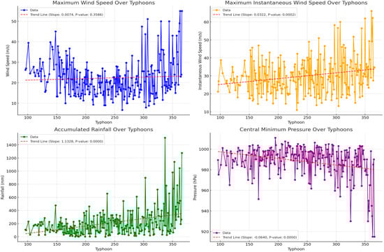 The analysis of maximum wind speed and maximum instantaneous wind speed shows an increasing trend in both parameters, suggesting that wind speeds associated with typhoons have been rising over time. In particular, the trend line for maximum instantaneous wind speed shows a statistically significant increase (p-value = 0.0002), indicating that the intensity of peak wind speeds during typhoons is escalating. Similarly, the accumulated precipitation demonstrates a significant upward trend (slope = 1.1328, p-value < 0.0001), indicating that the amount of rainfall associated with typhoons has been increasing. This increase in precipitation further exacerbates the risk of flooding and other weather-related disasters. On the other hand, the analysis of central minimum pressure shows a decreasing trend (slope = −0.0640, p-value < 0.0001), which suggests that typhoons impacting the Korean Peninsula are becoming more intense. A lower central minimum pressure is typically associated with stronger, more destructive typhoons, which could lead to greater damage from wind and storm surge.