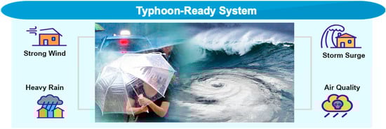 In this study, the TRS was developed to address multi-hazards that can occur on the Korean Peninsula during typhoon impact periods. The system (Figure 4) is designed to provide efficient information for disaster prevention activities related to typhoons, which are often accompanied by multi-hazards. This approach is particularly well suited for Korea, where multi-hazards can occur simultaneously due to the country’s diverse topographical features.