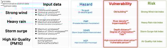 As shown in Figure 5, the algorithm for calculating the risk index incorporates various input data, such as wind speed, precipitation, storm surge height, and air quality measurements (PM10 concentration), during typhoon periods. These inputs are used to assess specific hazards, like wind gusts, probable maximum precipitation, storm surge height, and high air pollution. The system then calculates the vulnerability of a region by considering factors such as building age, urbanization level, and proximity to rivers. Finally, the risk index is derived for each hazard—strong wind, heavy rain, storm surge, and air quality—by combining the hazard magnitude with the region’s vulnerability characteristics. This risk index helps to provide a comprehensive assessment of the potential impact of typhoons on the Korean Peninsula.