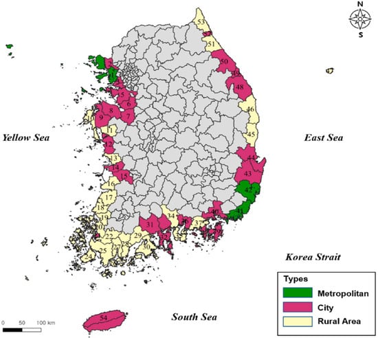 As a storm surge approaches the shore, friction between the water and the seabed reduces its speed. Consequently, the wave’s speed decreases in shallower waters and increases in deeper waters. Higher speeds result in less energy loss as the wave travels, leading to greater destructive power upon landfall. In this study, the depth separation distance was considered as a disaster factor in SSHPI. The coastal administrative districts were categorized into three regions—West Sea, South Sea, and East Sea—based on the depth separation characteristics, which were applied in the analysis. When evaluating the risk to coastal areas, the degree of urbanization was included as a vulnerability factor. The Korean Peninsula, the subject of this study, has 55 coastal administrative districts managed by relevant central government agencies. These districts were classified into metropolitan, urban, and rural areas by [], and this classification was used in this study (Figure 7). Figure 7 visually depicts the degree of urbanization in these coastal districts, illustrating those metropolitan areas, which tend to have higher levels of urbanization, may face greater vulnerability to storm surges due to increased impermeable surfaces and higher population density.
