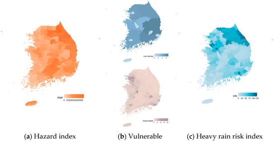 In Figure 8a, the hazard index, represented by the probable maximum precipitation (PMP), indicates that the highest rainfall was expected in Gangwon-do, Gyeongsang-do, I modified it.and Jeju. These areas recorded significantly higher PMP values, meaning that these regions were at a higher risk of extreme rainfall during Typhoon Rusa. Figure 8b shows the vulnerability factors, including river density and impermeability rate, which are essential for calculating the overall risk. Regions with a higher river density, such as Gangwon-do and parts of the metropolitan area, are more vulnerable to flooding due to the increased risk of overflowing rivers. The impermeability rate, which measures the percentage of land that cannot absorb water (e.g., urbanized areas), also plays a crucial role. Areas with high impermeability rates, such as the metropolitan area and parts of Gyeonggi-do, have a greater risk of surface runoff and flooding, even if the total rainfall is moderate. Figure 8c combines these factors to calculate the HRI. While areas like Gangwon-do show high HRI values due to their high PMP, other regions such as the metropolitan area and Gyeonggi-do, where the PMP was moderate, still exhibit a high HRI due to their higher vulnerability factors. This demonstrates how regional vulnerabilities, such as urbanization and river density, can amplify the risk of flooding even when the rainfall itself is not the most extreme. The example of Typhoon Rusa underscores the importance of considering both meteorological hazards and regional vulnerabilities when assessing the risk of heavy rain.