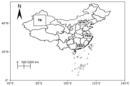 Locations of study areas in China. The Tarim Basin (TB, region: 36–45° N, 80–91° E), Pearl River Delta (PRD, region: 22–24° N, 112–115° E), Yangtze River Delta (YRD, region: 29–33° N, 117–122° E), and Beijing–Tianjin–Hebei region (BTH, region: 38–41° N, 114–119° E) are considered four representative regions in China in the study.