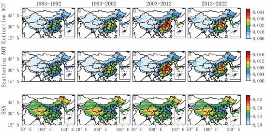 The seasonal variations in BC’s extinction AOT, scattering AOT, and SSA over China from 1983 to 2022 are shown in Figure 4. As shown in Figure 4a, similar seasonal patterns for the extinction AOT are observed in different decades. The largest extinction AOT is observed in summer, followed by autumn and winter, and the spring has the smallest extinction AOT. The high extinction AOT in summer may be attributed to biomass burning due to crop harvesting [21]. For the scattering AOT, different seasonal patterns are shown in the different decades during the last three decades. During 1983–2002, the scattering AOT was lowest in autumn and highest in spring. During 2003–2012, the scattering AOT was largest in summer and smallest in autumn. However, during 2013–2022, the smallest scattering AOT was seen in spring, while the highest value was observed in winter (see Figure 4b). The high scattering AOT in winter may be attributed to the coal widely used in northern China, in addition to the frequent temperature inversion and strong atmospheric stability [22,23].