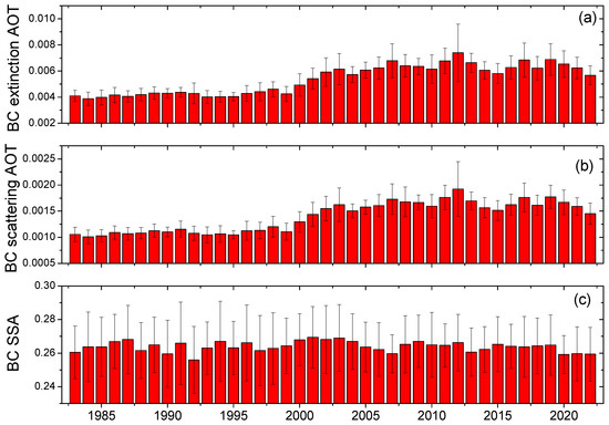The extinction and scattering AOTs of BC show similar spatial distribution patterns with high values in eastern and southern China, generally as opposed to BC’s SSA. A decrease in BC’s extinction and scattering AOTs has been documented over the last decade, and this indicates the implementation of environmental protection policies. The mean BC extinction AOT, scattering AOT, and SSA over China during 1983–2022 were 0.0054, 0.0014, and 0.264, respectively. BC’s SSA also showed small variations during 1983–2022, although a high BC extinction AOT and scattering AOT have been seen over the last two decades. This probably indicates the variations in aerosol composition and emission patterns and the existence of dust aerosols [8]. During the different decades, the seasonal patterns of BC’s extinction and scattering AOTs may differ, whereas BC’s SSA shows seasonal consistency. Significant monthly variations in BC’s SSA were seen during the four decades, which are in agreement with seasonal patterns.