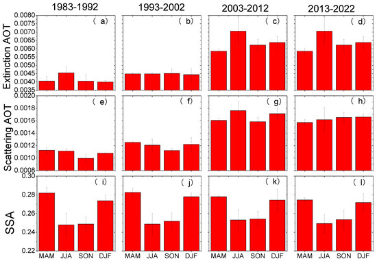 Seasonal average BC extinction AOT, scattering AOT, and SSA over mainland China in spring (MAM), summer (JJA), fall (SON), and winter (DJF). The results for the periods 1983–1992 (a,e,i), 1993–2002 (b,f,j), 2003–2012 (c,g,k), and 2013–2022 (d,h,l) are shown.