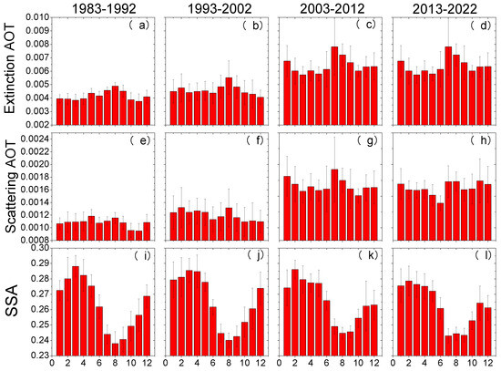 Monthly average BC extinction AOT (a–d), scattering AOT (e–h), and SSA (i–l) over mainland China. The results for the periods 1983–1992 (a,e,i), 1993–2002 (b,f,j), 2003–2012 (c,g,k), and 2013–2022 (d,h,l) are shown.