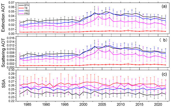 Temporal variations in annual average BC extinction AOT (a), scattering AOT (b), and SSA (c) over the TB, PRD, YRD, and BTH regions from 1983 to 2022.