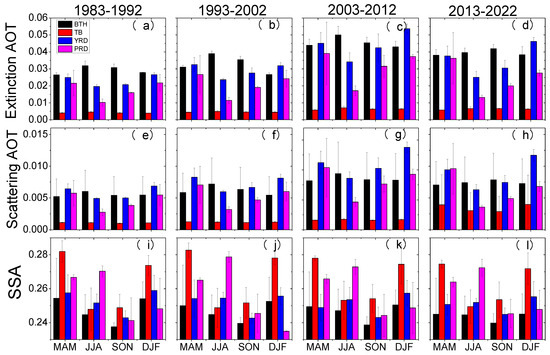 Seasonal average BC extinction AOT (a–d), scattering AOT (e–h), and SSA (i–l) in the TB, PRD, YRD, and BTH regions in spring (MAM), summer (JJA), fall (SON), and winter (DJF). Results during 1983–1992 (a,e,i), 1993–2002 (b,f,j), 2003–2012 (c,g,k), and 2013–2022 (d,h,l) are shown.