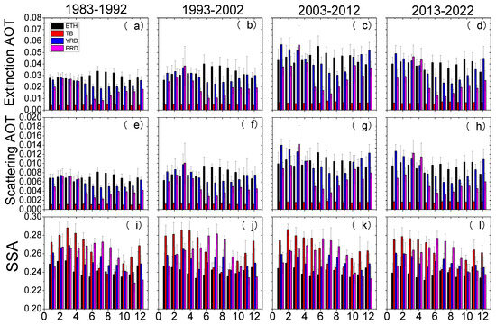 Monthly average BC extinction AOT (a–d), scattering AOT (e–h), and SSA (i–l) in the TB, PRD, YRD, and BTH regions. Results in the periods of 1983–1992 (a,e,i), 1993–2002 (b,f,j), 2003–2012 (c,g,k), and 2013–2022 (d,h,l) are considered.