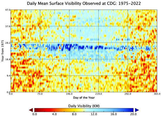 Daily average surface visibility in km observed at Paris Charles de Gaulle Airport (CDG) since 1975. An unknown systematic switch in statistics occurred during 2000–2002 (the 25th to 27th year after 1975) that affects mostly on the results in the clear (high percentile) than haze (low percentile) days.