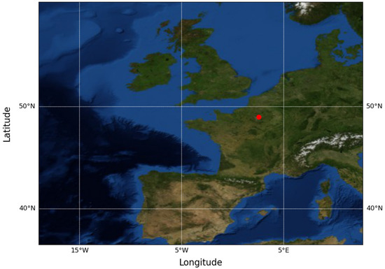 The data domain of meteorological and hydrological input features, consisting of 96 latitudinal and 128 longitudinal grids with an increment of 0.25 degree. The red dot marks the location of Charles de Galle Airport.