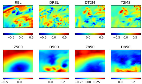 It is well known that the characteristic spatial and temporal scales of meteorological features likely differ from each other [23,24]). For example, the upper panels of Figure 4 are normalized maps of four meteorological variables, from left to right: surface relative humidity (REL) alongside its diurnal change (DREL), a diurnal change of 2m temperature (DT2M), and the daily standard deviation of 2m temperature (T2MS). Each of these figures contains many small spatial-scale patterns, reflecting local weather changes. In contrast, four normalized maps in the lower panels, showing a geopotential at 500 (Z500) and 850 hPa (Z850), along with their corresponding diurnal changes (D500 and D850), respectively, consist of smoothly distributed color belts across many grids. These distributions reflect the characteristics of large-scale atmospheric circulation or weather systems, which evolve much slower than the smaller scale patterns and are less sensitive to the impact factors of the latter, such as clouds, rainfall, boundary layer processes, and so forth, as seen in the upper panels. Therefore, a key issue in making CNN effectively learn these maps involves recognizing patterns of weather or hydrological features with different characteristic spatial scales, which, in many cases, far exceed the pixel level of the maps. Therefore, high resolution at the pixel level, in such cases, is not necessarily the most critical factor in improving the learning, making it a different task from common image recognition projects.