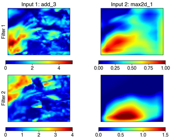 (Left) The outputs from the small kernel branch (input1) just before the concatenate layer of HazeNetb2, shown only the first two filter sets. (Right) The same but for the outputs from the large kernel (input2) branch. Each panel has 48 by 64 pixels. Different color scales are used for various panels to highlight their distributions.