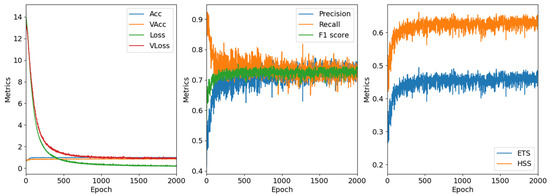 Dynamically calculated validation scores of statistical performance metrics with training progression in a classification training of HazeNetb. Each score point represents statistics of results calculated using the entire validation dataset. Here Acc and Loss represent the accuracy and loss in training, respectively, VAcc and VLoss the same metrics but in validation; while others are all validation scores commonly used in classification forecasting: precision, recall, and F1 score have a range of [0, 1], ETS is the equitable threat score with a range of [−1/3, 1], and HSS is the Heidke skill score ([−inf, 1]), all derived based on the so-called confusion matrix (Ref. [3]) for their definitions).