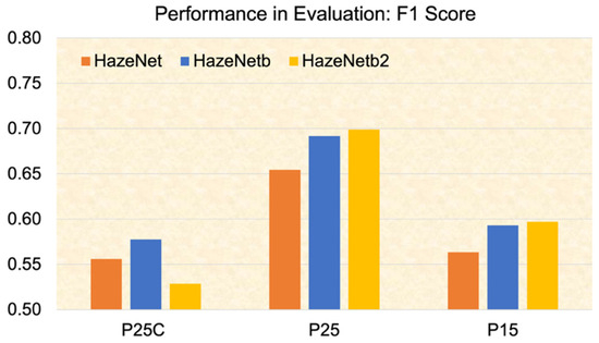 The evaluation results suggest that both branched architectures have achieved better performance in both the classification mode and regression–classification mode compared to the original HazeNet (Figure 10 and Table 4). The F1 score of the branched architecture is about 4–5% higher than that of the original HazeNet in the classification mode (P25C) and 6–7% higher in the regression–classification mode (P25). The performance improvements achieved by branched architectures in evaluation, particularly in the regression–classification mode, are even more significant than those reflected in the validation. Comparing the two branched architectures, HazNetb2 delivered a slightly higher F1 score than HazeNetb in the regression–classification mode, while the latter performed better in classification. Again, the regression–classification machines, regardless of the adopted architecture, achieved F1 scores of about 10% or higher compared to those obtained by their classification twins. Like the finding in the validation analysis, the advantage of the regression–classification machines in the precision score is much more evident than in the recall score. For example, in the case of HazeNetb2, precision is 0.66 versus 0.42, and recall is 0.74 versus 0.70 in regression–classification versus classification, respectively. Regarding the scores of regressions machines before being translated into classification metrics, HazeNetb2 produced a 9.92% mean absolute percentage error, while HazeNetb obtained 9.82%; both were lower than the same metrics of HazeNet in 10.02%. The evaluation results also demonstrate, as shown in Table 4, that the performances of all machines generally degrade as the probability of targeted events decreases.