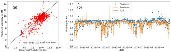 Evaluation results of HazeNetb2 using data from 2021 to 2023: (a) a scatter plot of predicted versus observed quantities of vis. in km; and (b) the same comparison but displayed as time series. Total number of LVD (P25) during the 3-year period is 118.