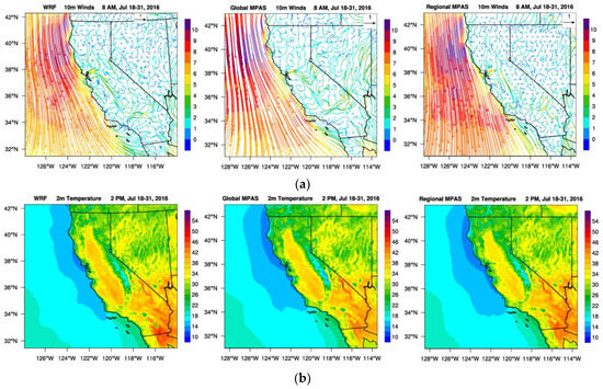 We carried out the model performance analysis of both global and regional applications of MPAS over the evaluation domain similar in size to the area used in fine grid WRF domain located between 31.8 °N and 42.6 °N latitudes and 127 °W and 112.6 °W longitudes (Figure S3). However, we did not focus on the model performance of all three modeling applications for the evaluation of temporal evolution of model variables outside of California. Four-dimensional data assimilation (FDDA) in the form of grid nudging or observational nudging (e.g., [36,37,38]) was not available in MPAS at the time this study was carried out and was not used while the WRF simulations utilized grid nudging with surface and upper air data archived at NCAR. NARR, GFS, and SST data were all prepared by WRF Preprocessing System (WPS) that is available from NCAR to initialize both WRF and MPAS models (https://www2.mmm.ucar.edu/wrf/users/download/get_source.html (accessed on 10 March 2021)). Bullock et al. [39] and Judt [39] showed that MPAS errors can build by the 10th day into the simulation and significant differences between observed and predicted model results could be observed, especially in the Polar Regions. Here, we took a more stringent approach to limit the accumulation of modeling errors and each two-week episode was divided into five-day segments with one day spin-up added to the beginning of each segment for all three modeling applications, which is the same approach that was taken by Chen et al. [20] in their WRF simulations.
