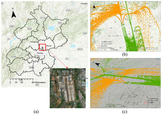 ADS-B waypoint samples in PEK airport (Date: 16 October 2021). TO_Traj means the takeoff and climb waypoints and AP_Traj means the approach and idle waypoints in reality. The location of Beijing Capital International Airport (PEK) (a). Inbound and outbound flight trajectories at PEK (horizontal view) (b). Inbound and outbound flight trajectories at PEK (3D view) (c).