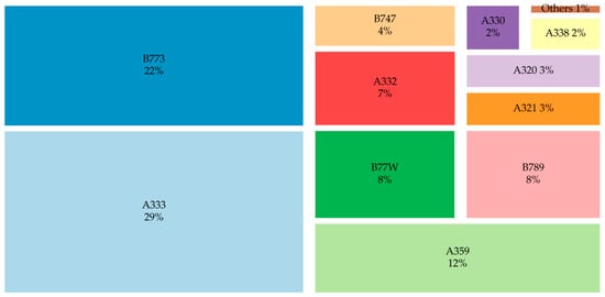 Here, to demonstrate our method, we use all the flights between Beijing Capital International Airport (PEK) and Shanghai Hongqiao International Airport (SHA) from 16 to 22 October 2021 to conduct experiments. Figure 2 illustrates the number of flights for each aircraft type on the PEK-SHA route. A333 accounts for 29%, while B773 represents 22%, together comprising 51% of total flights. Additionally, A359 flights make up 12%, and both B77W and B789 each account for 8%.