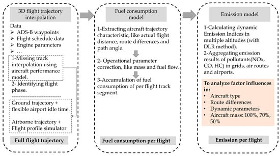 The technical framework of TrajEmission is shown in Figure 3. Firstly, flight schedule information and ADS-B trajectories are integrated. The trajectory dataset is filtered by missing field values and preprocessed to interpolate the missing parts and reconstruct trajectories. Secondly, overall fuel consumption is calculated with parameters depending on the flight status, by aggregating the flight segment fuel cost. Thirdly, real-time emissions will be estimated based on fuel consumption, with emission indices affected by aviation pollutant types, air speed, and altitude. Subsequently, we examine the impact of the model parameters on the emission results.