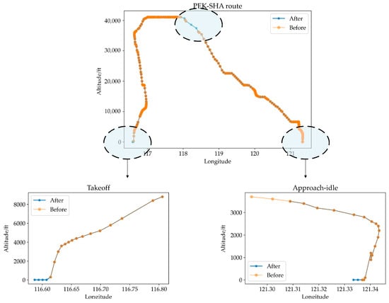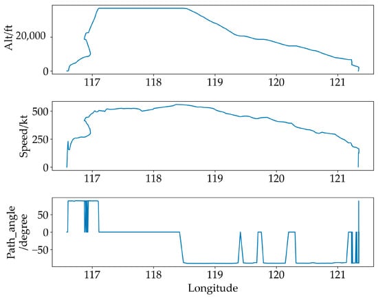 The recorded waypoints suffer from discontinuity due to the incomplete station coverage. To ensure trajectory integrity, we interpolate the missing trajectory segments utilizing an open-source toolkit openAP []. The kinematic aircraft performance model (WRAP) in openAP is used for operational parameter estimation and simulated trajectory generation. It proposes distinct methods for modeling each flight phase, and shows better performance in estimating real-time engine thrust, air speed, vertical rate, altitude, and travel distance []. Before data processing, we use linear regression to fill blank field values. If the total flight track has a climb–cruise–approach phase but is missing some parts, we will use linear regression to interpolate missing coordinates and other fields, to reduce computational costs. If the flight phase is not complete, WRAP can help to simulate it if the trajectory segments miss a lot and linear interpolation does not work well. The example of trajectory imputation is shown in Figure 4. Specific steps are as follows: