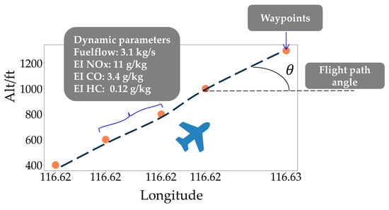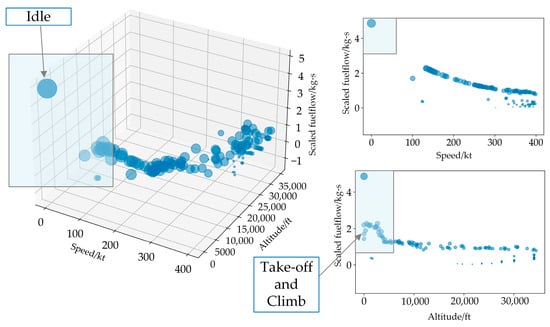 Fuel flow indicates the amount of fuel consumed by the engine per unit time, in kg/s. It is related to the aircraft type, engine parameters, flight operational time (time-in-mode), flight time. The calculations of fuel consumption and fuel flow are shown as Formulas (1) and (2) [,]. Fuel flow varies in terms of the aircraft mass, true air speed, and flight mode. An aircraft will likely have maximum fuel flow at takeoff and less at cruise. The physical meaning of each parameter is shown in Figure 5.