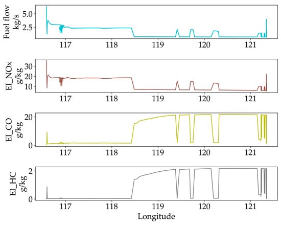 TrajEmission accounts for dynamic emission index (EI) values across various temperatures and pressures at multiple altitudes. We apply the DLR method to correct the static values in ISA. For example, A333 has the highest number of flights on the PEK-SHA route. Table 3 presents the EI values for the ICAO advanced approach sourced from the ICAO Emission Estimation Database (EEDB). It only has the values for the LTO cycle. To accurately adjust the EI values during cruise, we correct the for each flight segment based on the actual flight status, as illustrated in Figure 6. Here, in Figure 7, as the altitude and flight speed increase, gradually decreases. In contrast to , the and exhibit distinct trends. Under low-altitude and low-speed conditions, the HC and CO emission indices are higher, corresponding to a greater proportion of emissions that may occur at the approach and idle phase.