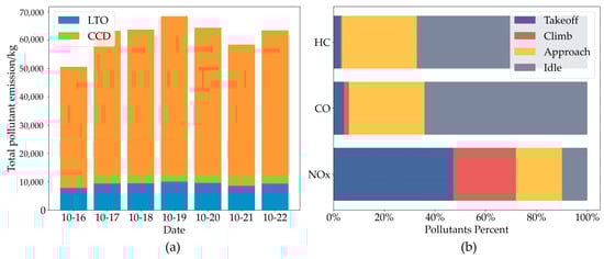 In total, the PEK-SHA route emitted 64,300 kg of pollutant emissions during the LTO phase and 365,200 kg of pollutant emissions during the CCD phase. As shown in Figure 8a, the average daily emissions during the weekend (Date: 16 and 17 October) are lower than the emissions on working days (Date: 18–22 October). LTO emissions account for 10–20% of the total emissions. The total amount of NOx emissions is the 40.7t, followed by 21.5 t of CO and 2.1 t of HC. In terms of the phase share in the LTO cycle from Figure 8b, NOx is emitted most at takeoff, then the climb phase, and emitted less at the approach and idle phase. This is due to the fact that at the beginning of takeoff, the aircraft requires more thrust. The engine power efficiency is higher at this time and ultra-high temperatures promote NOx conversion. When the aircraft starts to land and idle, less thrust is required, and the NOx emission share reduces. In contrast, CO and HC emissions are higher while descending and taxiing. It is probably because when the engine power reduces as the aircraft lands, aviation kerosene incomplete combustion leads to more CO and HC [].