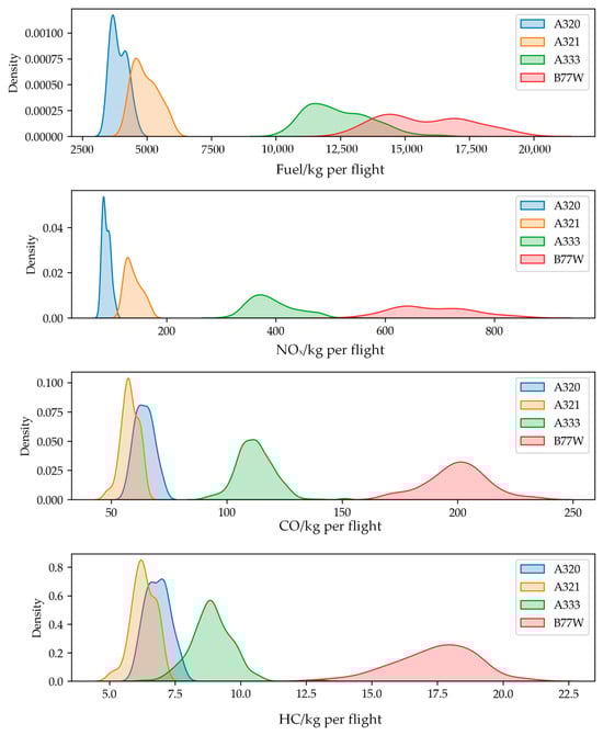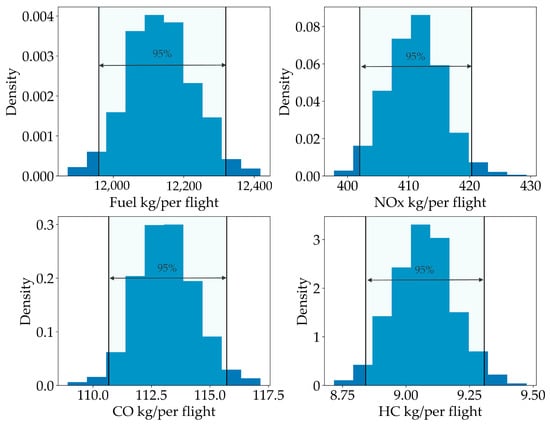 Typically, the 95% confidence interval is used to assess the uncertainty of emission inventories, but it will have a bias given the non-normal distribution. We use Bootstrap to analyze the uncertainty in the estimation of the aviation emission results here. The effectiveness of this method for uncertainty analysis of carbon emissions has been demonstrated []. The advantage of Bootstrap is that it does not depend on the distributional assumptions of the data, but rather generates a large number of bootstrap samples from the target dataset, and then calculates the statistic for each bootstrap sample to construct a distribution of the statistics [,]. We take 1000 samples of the fuel and emission results of each flight, select the statistics as the mean, and calculate the 95% confidence interval of the results. Figure 9 represents the bootstrap samples’ probability density distribution for one flight. On the PEK-SHA route, the fuel consumption is between 11,959.3 kg and 12,319.2 kg/per flight, the NOx emission is between 402.0 kg and 420.3 kg/per flight, the CO emission is between 110.7 kg and 115.7 kg/per flight, and the HC emission is between 8.8 kg and 9.3 kg/per flight within the 95% confidence interval. Therefore, the uncertainty of the estimation of fuel ranges ±185 kg/per flight on the PEK-SHA route using TrajEmission, and NOx uncertainty ranges ±8.9 kg/per flight. CO uncertainty ranges ±2.6 kg/per flight. HC uncertainty ranges ±0.25 kg/per flight.