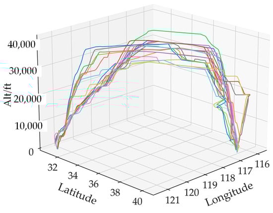 - If the flight phase type is less than 3, which means the missing waypoints are too many, these flight records will be replaced by the simulation trajectory on the whole, according to the maximum cruise altitude. Since the maximum cruise altitude varies between aircraft types, it is set to the empirical altitude from actual ADS-B data. Simulation time interval is set as 30 s.