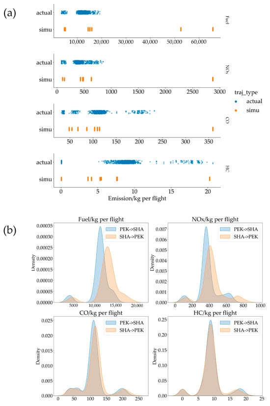 TrajEmission results (traj_type = actual) compared with Tier 3B method results (traj_type = simu) of each flight on PEK-SHA route (a). The probability distributions of emissions show a bias for round trips calculated with actual flight trajectories. Emission results are not exactly the same for the same city pair (b).