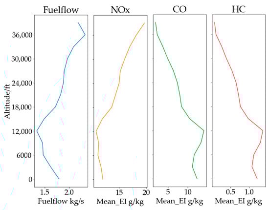 In addition to the discrepancies in trajectories, the engine parameters along with flight status are also influenced. Figure 13 shows summary statistics that the average emission parameters change with altitudes. The EI can indicate the emission per fuel consumption unit.