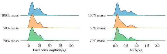 Overall fuel consumption using 100% mass, 70%, and 50% mass is 9842 t, 8741 t, and 8211 t. The 50% mass fuel is 16.6% lower than the 100% one and the 70% result is 11.2% lower. As for NOx emissions, the 50% mass result is 26.8% lower than the 100% one, and the 70% mass result is 19.0% lower than the 100% mass result. The frequency distribution discrepancy is shown in Figure 15, taking A320 as an example. Emissions will be exaggerated if the aircraft mass bias is not taken into account.