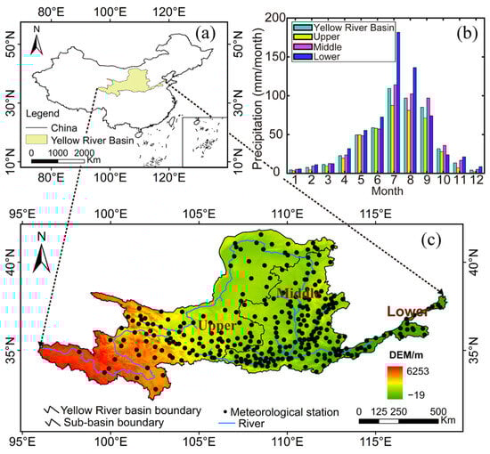 The map of the Yellow River Basin, including (a) the geographical location of the Yellow River Basin in China, (b) monthly precipitation in the Yellow River Basin and its sub-basins, and (c) the terrain conditions and distribution of the meteorological stations used in this study.