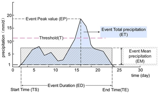 Once EPEs are identified, their characteristics can be quantified. The capacity of remote sensing data to detect EPEs can be assessed through these quantified attributes. To characterize an EPE, five fundamental metrics are primarily utilized: event duration (ED), event total precipitation (ET), event mean precipitation (EM), event peak value (EP) and event frequency (EF). ED is the time difference between the end time (TE) and the start time (TS) of an EPE, primarily measuring the length of the event. ET is the total precipitation during an EPE, used to assess the severity of the event. The ratio of the ET to ED gives the EM, describing the event’s intensity. Additionally, the maximum precipitation during an EPE is referred to as EP, also indicating the event’s intensity. Figure 2 illustrates the definition and characteristics of EPEs. Furthermore, by counting the total number of EPEs within a specified time frame, we can determine EF, which describes the variation in the occurrence of EPEs across different regions.